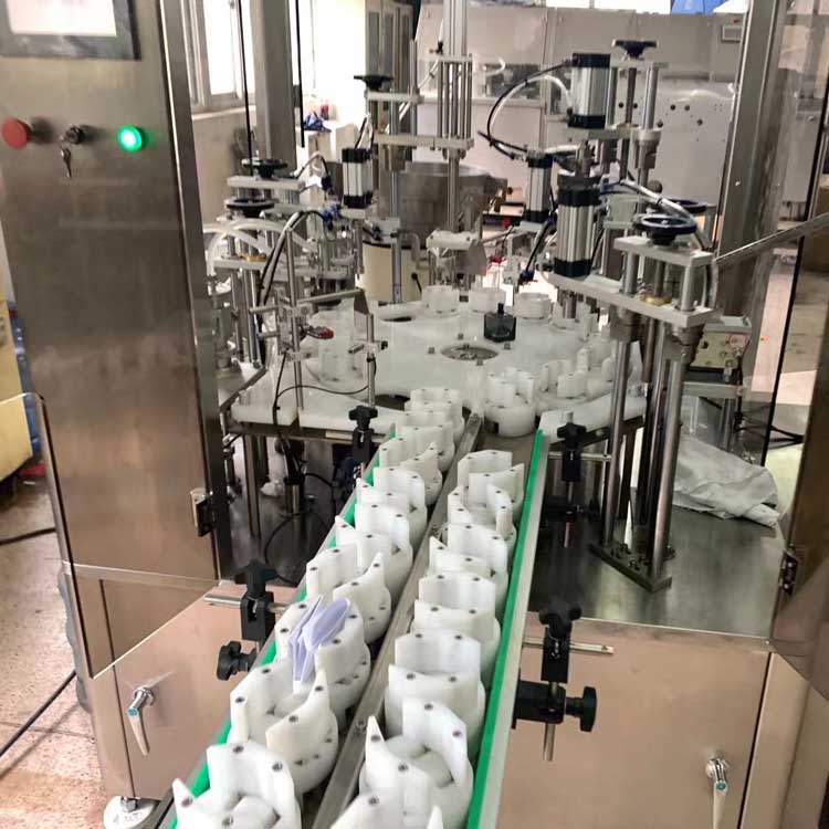 ZHS-50香水灌裝鎖蓋機(jī)采用PLC控制,操作簡單,調(diào)節(jié)方便。具有自動灌裝玻璃瓶,上噴霧蓋,鎖蓋的功能,香水瓶體輸送采用循環(huán)瓶體模具的方式,有效穩(wěn)定地輸送包材瓶子,活塞氣缸進(jìn)行定量灌裝,使每只瓶體液面保持高低一致。上蓋裝置采用機(jī)械手取蓋,下蓋,扎蓋裝置采用單汽缸伺服扎蓋方式,整機(jī)設(shè)計新穎實(shí)用,操作科學(xué)簡便。